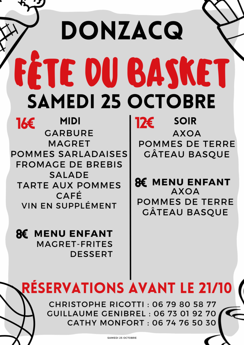 Dans l’intervalle, Avenir Basket Chalosse propose sa fête sportive avec repas, samedi midi et soir. Les détails du menu figurent ci-dessous et, si vous avez malheureusement oublié de vous inscrire, merci de contacter, au plus vite, Guillaume au 06 73 01 92 70.