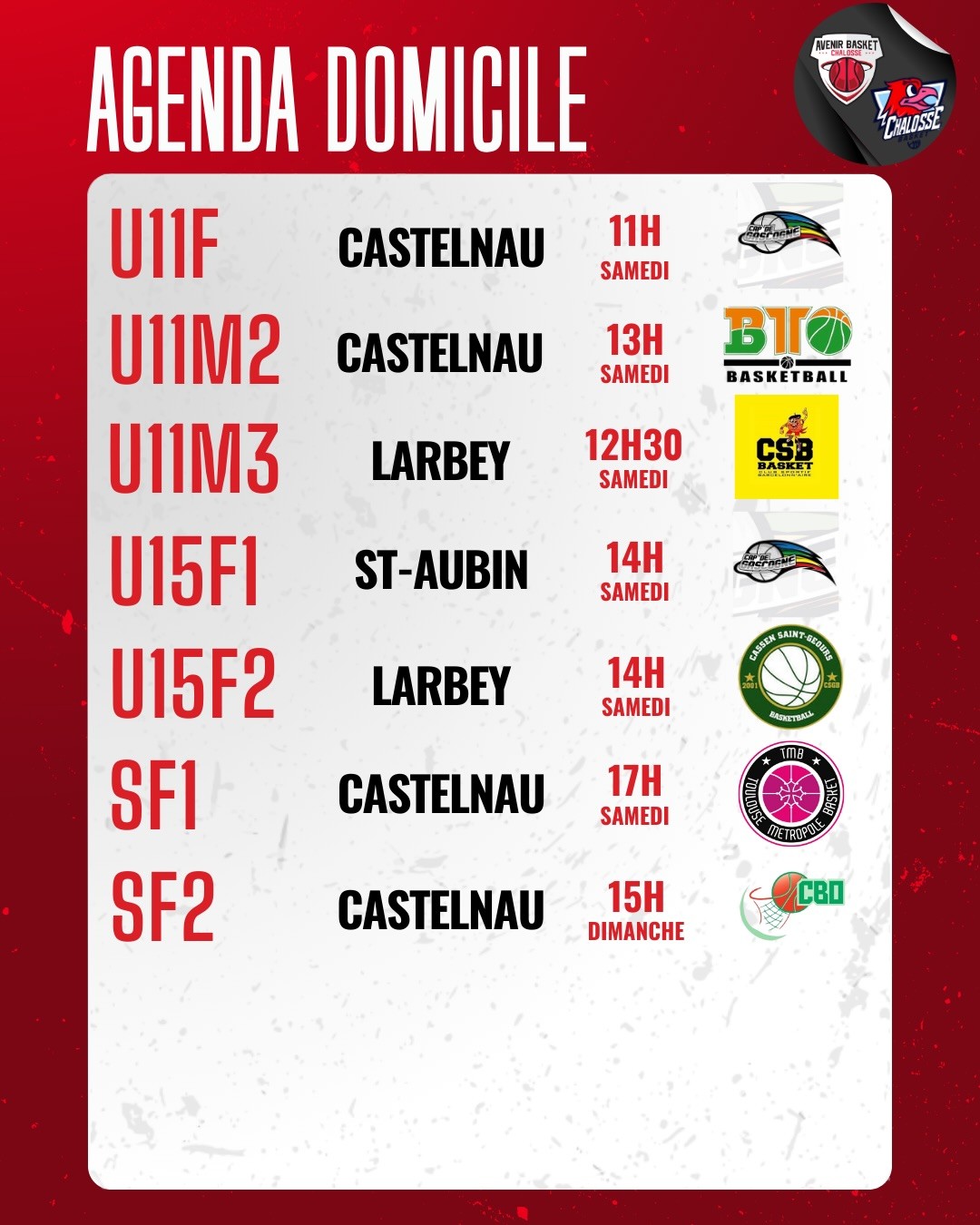 Le dimanche, c’est toujours à Castelnau Chalosse qu’on vous attendra pour le match de régionale 2 féminine : ABC – Cauneille Basket (15H).
