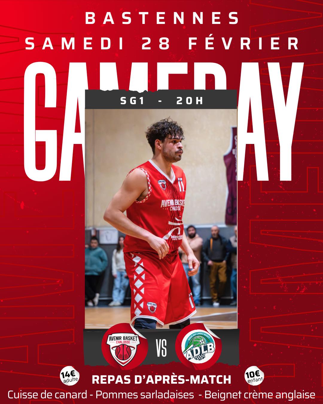 Pour samedi, le match qui retient notre attention se déroulera à Bastennes avec les garçons 1 qui recevront Adour Dax Landes Basket 2. La rencontre débutera à 20H et sera suivie d’un bon repas : cuisse de canard, pommes sarladaises, beignet, crème anglaise (14 €).